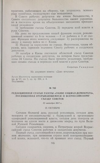 Редакционная статья газеты «Голос социал-демократа», посвященная открывающемуся II Всероссийскому съезду Советов. 25 октября 1917 г.