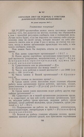 Опросный лист ЦК РСДРП(б) с ответами добрянской группы большевиков. Не ранее августа 1917 г.