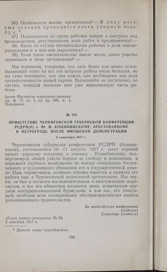 Приветствие Черниговской губернской конференции РСДРП(б) т. Ю.М. Коцюбинскому, арестованному в Петрограде после июльской демонстрации. 5 сентября 1917 г.