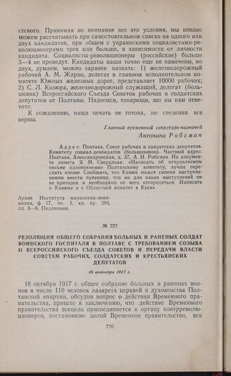 Резолюция общего собрания больных и раненых солдат воинского госпиталя в Полтаве с требованием созыва II Всероссийского съезда Советов и передачи власти советам рабочих, солдатских и крестьянских депутатов. 18 октября 1917 г.