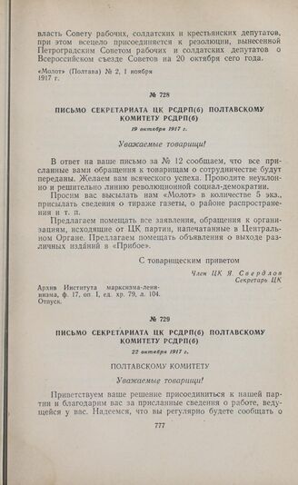 Письмо Секретариата ЦК РСДРП(б) Полтавскому комитету РСДРП(б). 19 октября 1917 г. // Архив Института марксизма-ленинизма, ф. 17, оп. 1, ед. хр. 79, л. 104. Отпуск.