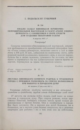 Письмо солдат Винницкой починочно-обмундировальной мастерской в газету «Голос социал-демократа» с сообщением о сборе средств для создания типографии газеты. 4 августа 1917 г. // «Голос социал-демократа», № 87, 4 августа 1917 г.