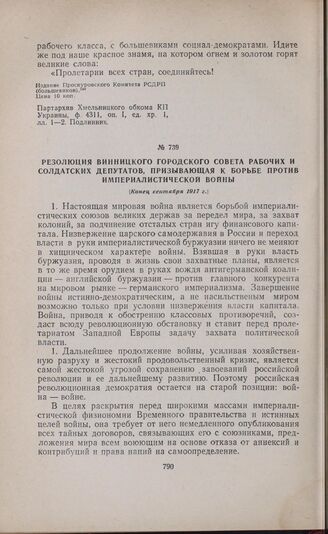 Резолюция Винницкого городского Совета рабочих и солдатских депутатов, призывающая к борьбе против империалистической войны. [Конец сентября 1917 г.] // ЦГАОР УССР, ф. 3045, ед. хр. 1, л. 19.