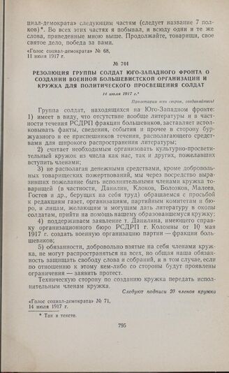 Резолюция группы солдат Юго-Западного фронта о создании военной большевистской организации и кружка для политического просвещения солдат. 14 июля 1917 г. // «Голос социал-демократа», № 71, 14 июля 1917 г.