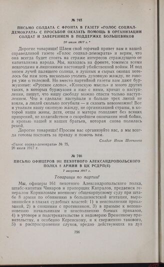 Письмо солдата с фронта в газету «Голос социал- демократа» с просьбой оказать помощь в организации солдат и заверением в поддержке большевиков. 20 июля 1917 г. // «Голос социал-демократа», № 75, 20 июля 1917 г,