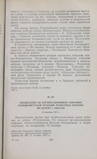 Объявление об организационном собрании большевистской фракции профсоюза рабочих по дереву г. Одессы. 16 октября 1917 г. // «Известия Одесского Совета рабочих депутатов и представителей армии и флота», № 158, 15 октября 1917 г.