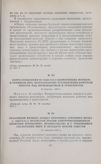 Корреспонденция из Одессы о конференции моряков и речников юга, потребовавших установления контроля рабочих над производством и транспортом. 21 октября 1917 г. // «Рабочий путь», № 44. 24 октября 1917 г.