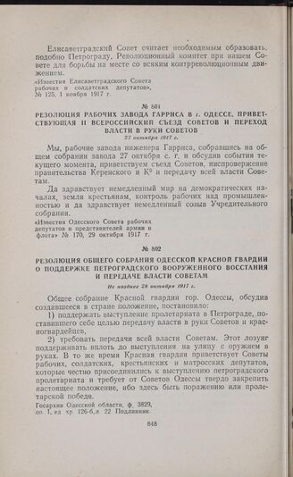 Резолюция рабочих завода Гарриса в г. Одессе, приветствующая II Всероссийский съезд Советов и переход власти в руки Советов. 27 октября 1917 г. // «Известия Одесского Совета рабочих депутатов и представителей армии и флота», № 170, 29 октября 1917 г.