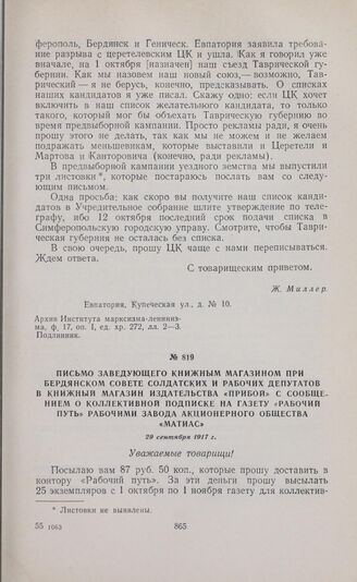 Письмо заведующего книжным магазином при Бердянском Совете солдатских и рабочих депутатов в книжный магазин издательства «Прибой» с сообщением о коллективной подписке на газету «Рабочий путь» рабочими завода Акционерного общества «Матиас». 29 сентября 1917 г. // Архив Института марксизма-ленинизма, ф. 17, оп. 1, ед. хр. 133, л. 94. Подлинник.