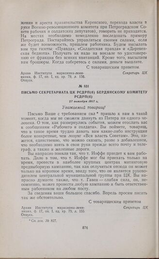 Письмо Секретариата ЦК РСДРП(б) Бердянскому комитету РСДРП(б). 27 октября 1917 г. // Архив Института марксизма-ленинизма, ф. 17, оп. 1, ед. хр. 79, л. 155. Отпуск.