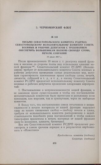 Письмо Севастопольского комитета РСДРП(б) Севастопольскому исполнительному комитету Совета военных и рабочих депутатов с требованием обеспечить большевикам полную свободу слова, печати, собраний. 13 июля 1917 г.