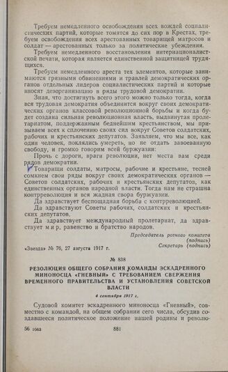 Резолюция общего собрания команды эскадренного миноносца «Гневный» с требованием свержения Временного правительства и установления Советской власти. 4 сентября 1917 г.