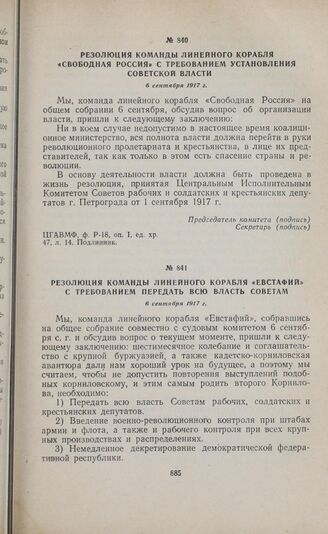 Резолюция команды линейного корабля «Евстафий» с требованием передать всю власть Советам. 6 сентября 1917 г. // Партархив Крымского обкома КП Украины, ф. 150, ед. хр. 97, л. 40. Копия.