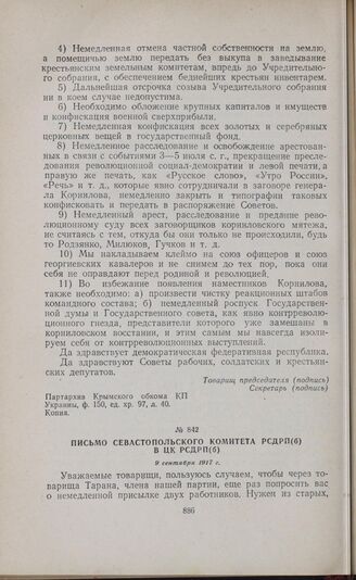 Письмо Севастопольского комитета РСДРП(б) в ЦК РСДРП(б). 9 сентября 1917 г. // Архив Института марксизма-ленинизма, ф. 17, оп. 1, ед. хр. 270, л. 3. Подлинник.