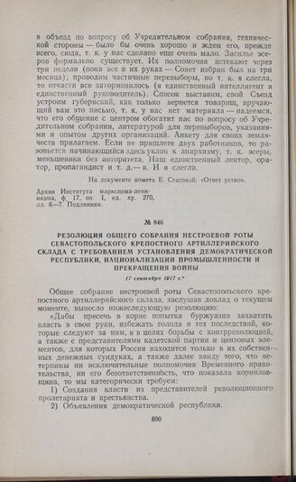 Резолюция общего собрания нестроевой роты Севастопольского крепостного артиллерийского склада с требованием установления демократической республики, национализации промышленности и прекращения войны. 17 сентября 1917 г. // «Пролетарий», № 132, 17 сентября 1917 г.