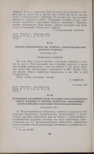 Письмо Секретариата ЦК РСДРП(б) Севастопольскому комитету РСДРП(б). 29 сентября 1917 г. // Архив Института марксизма-ленинизма, ф. 17, оп. 1, ед. хр. 79, л. 30. Отпуск.
