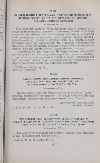 Приветственная телеграмма Севастопольского Совета военных и рабочих депутатов Петроградскому Совету и II Всероссийскому съезду Советов. 27 октября 1917 г. // «Прибой», № 62, 28 октября 1917 г.