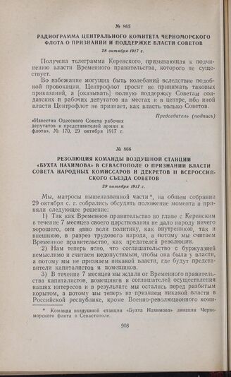 Резолюция команды воздушной станции «Бухта Нахимова» в Севастополе о признании власти Совета Народных Комиссаров и декретов II Всероссийского съезда Советов. 29 октября 1917 г. // «Звезда», № 130, 7 ноября 1917 г.