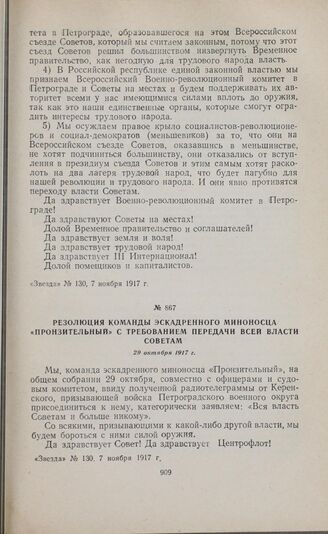 Резолюция команды эскадренного миноносца «Пронзительный» с требованием передачи всей власти Советам. 29 октября 1917 г.