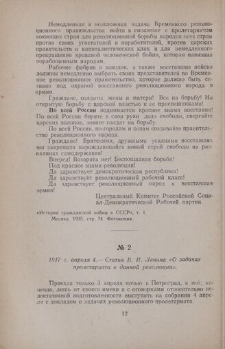 1917 г. апреля 4. — Статья В. И. Ленина «О задачах пролетариата в данной революции» // В. И. Ленин, Соч., т. 24, стр. 3—7.