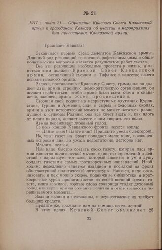 1917 г. июня 21. — Обращение Краевого Совета Кавказской армии к гражданам Кавказа об участии в мероприятиях дня просвещения Кавказской армии // Газета «Рабочий и солдат», № 24, 21 июня 1917 г.