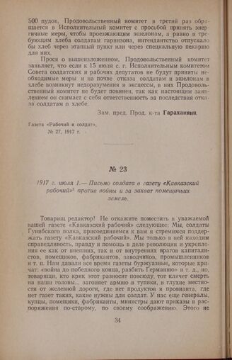 1917 г. июля 1. — Письмо солдата в газету «Кавказский рабочий» против войны и за захват помещичьих земель