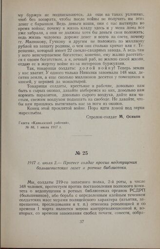 1917 г. июля 2. — Протест солдат против недопущения большевистских газет в ротные библиотеки // Газета «Кавказский рабочий», № 89, 2 июля 1917 г.