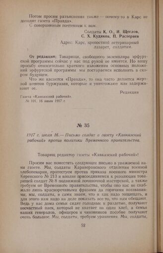 1917 г. июля 16. — Письмо солдат в газету «Кавказский рабочий» против политики Временного правительства // Газета «Кавказский рабочий», № 101, 16 июля 1917 г.