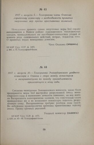1917 г. августа 5. — Телеграмма члена Озакома лорийскому комиссару о необходимости принятия энергичных мер против крестьянских волнений // ЦГАОР Груз. ССР, ф. 1472, д. 882, л. 75. Телеграфный бланк.