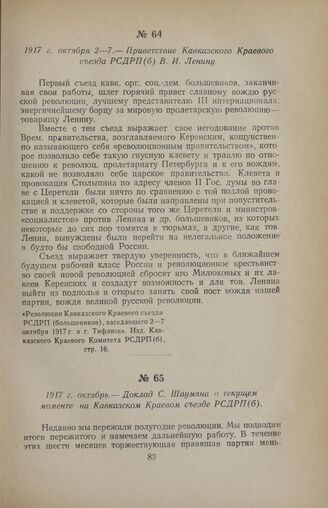 1917 г. октября 2—7. — Приветствие Кавказского Краевого съезда РСДРП(б) В. И. Ленину // «Резолюции Кавказского Краевого съезда РСДРП (большевиков), заседавшего 2—7 октября 1917 г. в г. Тифлисе». Изд. Кавказского Краевого Комитета РСДРП(б), стр. 16.