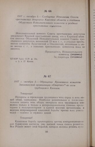 1917 г. октября 3. — Сообщение Исполкома Совета крестьянских депутатов Карсской области о создании Областного Исполнительного комитета и уездных крестьянских комитетов // ЦГАОР Груз. ССР, ф. 10с, д. 3, л. 27. Копия.