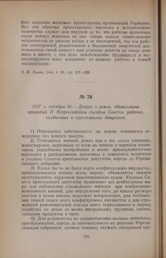 1917 г. октября 26. — Декрет о земле, единогласно принятый II Всероссийским съездом Советов рабочих, солдатских и крестьянских депутатов // В. И. Ленин, Соч., т. 26, стр. 226—228.