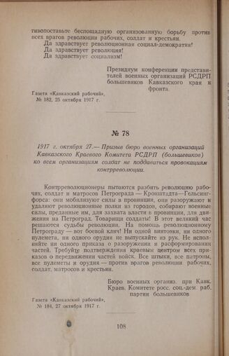 1917 г. октября 27. — Призыв бюро военных организаций Кавказского Краевого Комитета РСДРП (большевиков) ко всем организациям солдат не поддаваться провокациям контрреволюции