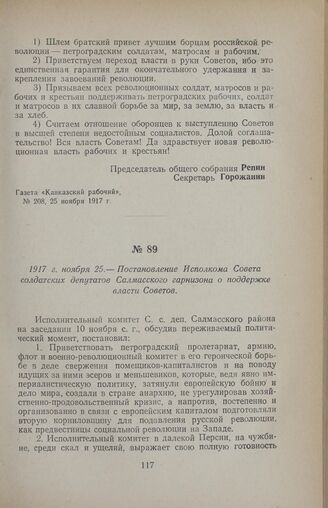 1917 г. ноября 25. — Постановление Исполкома Совета солдатских депутатов Салмасского гарнизона о поддержке власти Советов // Газета «Кавказский рабочий», № 208, 25 ноября 1917 г.
