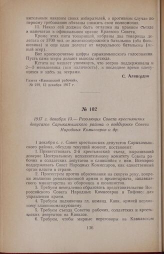 1917 г. декабря 13. — Резолюция Совета крестьянских депутатов Сарыкамышского района о поддержке Совета Народных Комиссаров и др. // Газета «Кавказский рабочий», № 219, 13 декабря 1917 г.
