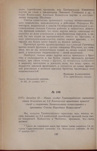 1917г. декабря 23. — Наказ солдат Трапезундского гарнизона своим делегатам на 2-й Кавказский армейский краевой съезд о свержении Закавказского комиссариата и признании Совета Народных Комиссаров // Газета «Кавказский рабочий», № 228, 23 декабря 1917 г.