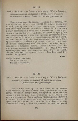 1917 г. декабря 13. — Телеграмма консула США в Тифлисе государственному секретарю о немедленном оказании финансовой помощи Закавказской контрреволюции // Foreign Relations, 1918, Russia, vol. II, pp. 589—590.
