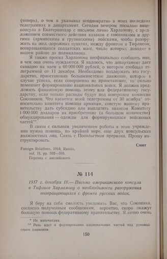 1917 г. декабря 18. — Письмо американского консула в Тифлисе Харламову о необходимости разоружения возвращающихся с фронта русских войск // Foreign Relations, 1918, Russia, vol. II, р. 607.