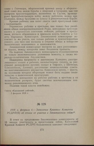 1918 г. февраля 4. — Заявление Краевого Комитета РСДРП(б) об отказе от участия в Закавказском сейме // Газета «Бакинский рабочий», № 32 (48), 23 февраля 1918 г.