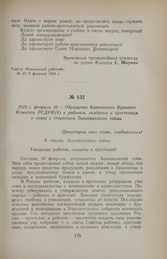 1918 г. февраля 10. — Обращение Кавказского Краевого Комитета РСДРП(б) к рабочим, солдатам и крестьянам в связи с открытием Закавказского сейма // Газета «Бакинский рабочий», 8 марта (23 февраля) 1918 г.
