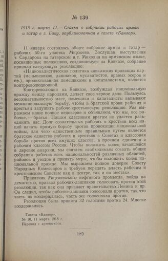 1918 г. марта 11. — Статья о собрании рабочих армян и татар в г. Баку, опубликованная в газете «Банвор» // Газета «Банвор», № 10, 11 марта 1918 г.