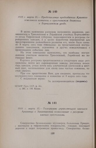 1918 г. марта 15. — Представление председателя Краевого земельного комитета о крестьянском движении в Борчалинском уезде // ЦГАОР Груз. ССР, ф. 41с, д. 261, л. 116. Копия.