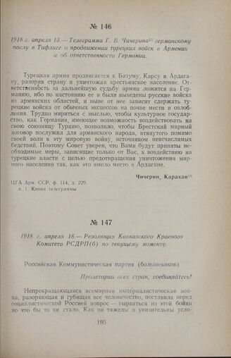 1918 г. апреля 18. — Резолюция Кавказского Краевого Комитета РСДРП(б) по текущему моменту // Партархив Армянского филиала ИМЛ, при ЦК КПСС, ф. 33, д. 720, св. 7. Копия.