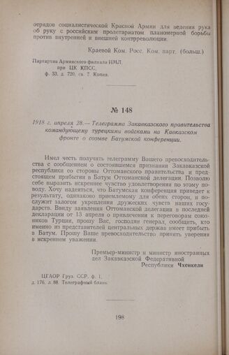 1918 г. апреля 28. — Телеграмма Закавказского правительства командующему турецкими войсками на Кавказском фронте о созыве Батумской конференции // ЦГАОР Груз. ССР, ф. 1, д. 176, л. 88. Телеграфный бланк