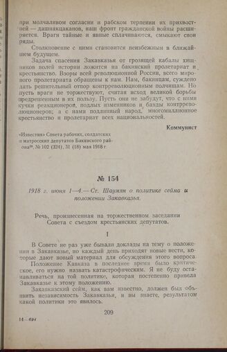1918 г. июня 1—4. — Ст. Шаумян о политике сейма и положении Закавказья