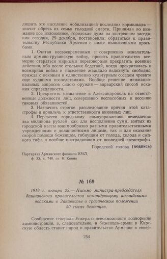 1919 г. января 25. — Письмо министра-председателя дашнакского правительства командующему английскими войсками в Закавказье о трагическом положении 50 тысяч беженцев // ЦГА Арм. ССР, ф. 200, д. 109, л. 86. Телеграфный бланк.