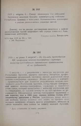 1919 г. августа 4. — Рапорт начальника 3-й отдельной Армянской пехотной бригады командующему войсками Республики Армении о появлении большевистских агитаторов в районе расположения воинских частей