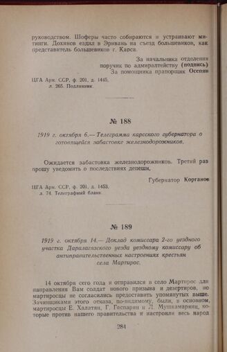 1919 г. октября 14. — Доклад комиссара 2-го уездного участка Даралагязского уезда уездному комиссару об антиправительственных настроениях крестьян села Мартирос // ЦГА Арм. ССР, ф. 201, д. 1445, л. 331. Подлинник.