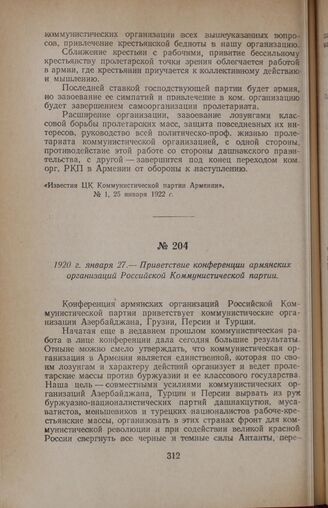 1920 г. января 27. — Приветствие конференции армянских организаций Российской Коммунистической партии // Партархив Армянского филиала ИМЛ, ф. 33, д. 832, стр. 1. Вырезка из газеты «Паак», № 9, 27 января 1920 г.