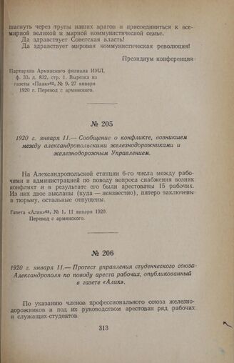 1920 г. января 11. — Сообщение о конфликте, возникшем между александропольскими железнодорожниками и железнодорожным Управлением // Газета «Алик», № 1, 11 января 1920.